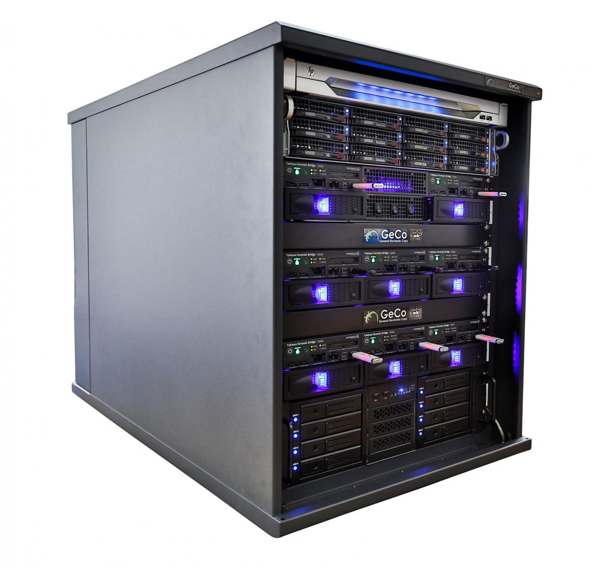 Because there are huge amounts of data by imaging eight devices simultaneously the GeCo will be equipped with a storage unit of 1760 TB. Through the simple IceTray coolers under the forensic Tableau T356789iu Bridge the source hard disks are actively air-cooled and passively supported by their aluminium cooling ribs. Thus, a reading of the hard drives with maximum speed is guaranteed.