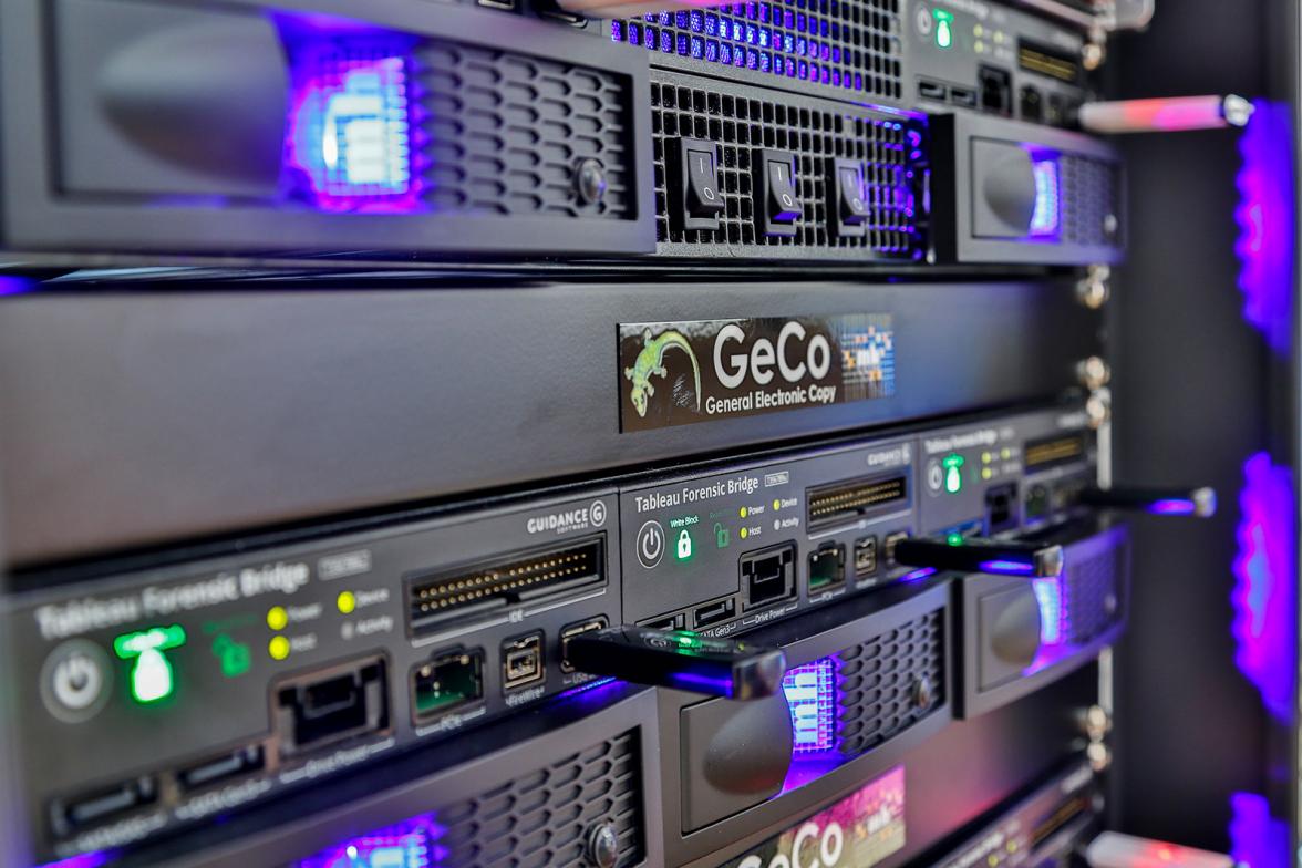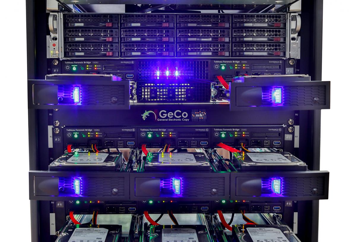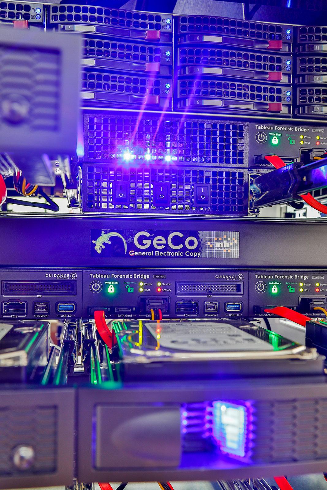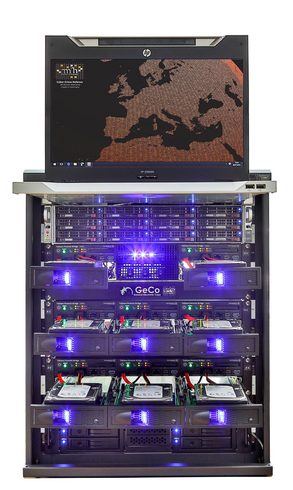 Forensic Imaging is at best just as fast as the suspect disk can be read. The only way to increase the speed is to create images as much as possible at the same time. For this the GeCo was developed. This system allows to copy eight data medium at the same time as well. Eight internal Writeblocker with PCle, SATA, IDE, SAS, USB and FireWire interface provide much more flexibility.