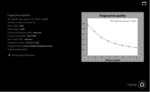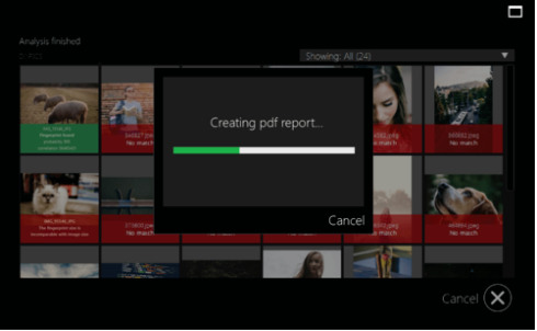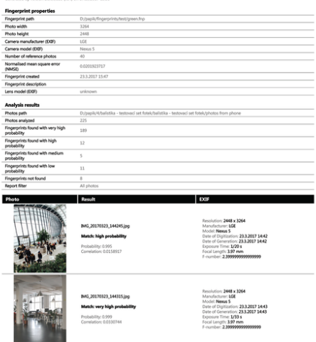 In diesem Schritt wird die im Lernprozess erstellte Fingerabdruck-Datei mit den zu untersuchenden Fotos abgeglichen. Bei Durchführung der Analyse sehen Sie den Verarbeitungsfortschritt, gefolgt von den mathematischen Daten und Ergebnissen der Analyse. Abschließend wird ein umfassender und strukturierter Bericht im pdf-Format ausgegeben, der als Beweis verwendbar ist. Der Bericht enthält klickbare Miniaturansichten aller verarbeiteten Bilder, des Gerätetyps und Modells, GPS-Daten, Kameraeinstellungen, mittlere quadratische Abweichung, Ergebnis der Fingerabdruckpräsenz, Übereinstimmungswahrscheinlichkeit und Korrelation.