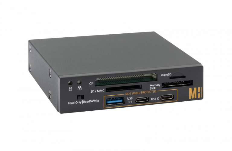 Der MH-FCR Forensic Card Reader ist ein multi-funktioneller Card Reader, der alle gängigen Speicherkarten lesen und beschreiben kann und zusätzlich über drei schnelle USB-Ports mit USB-C- und USB-A-Buchsen verfügt. Durch seine integrierten Schreibschutz-Schalter für Speicherkarten ist er im ,,Read Only"-Betrieb optimal für forensische Zwecke geeignet. Der Anschluss des MH-FCR erfolgt über einen schnellen USB-C-Anschluss (USB 3.2 Gen.1). Auf Grund seiner optimierten 3,5"-Bauform kann der MH-FCR sowohl als externes Gerät als auch intern im 3.5"-Einbauschacht bzw. 5.25"-Einbauschacht mit optimalem Einbaurahmen eingesetzt eingesetzt werden.