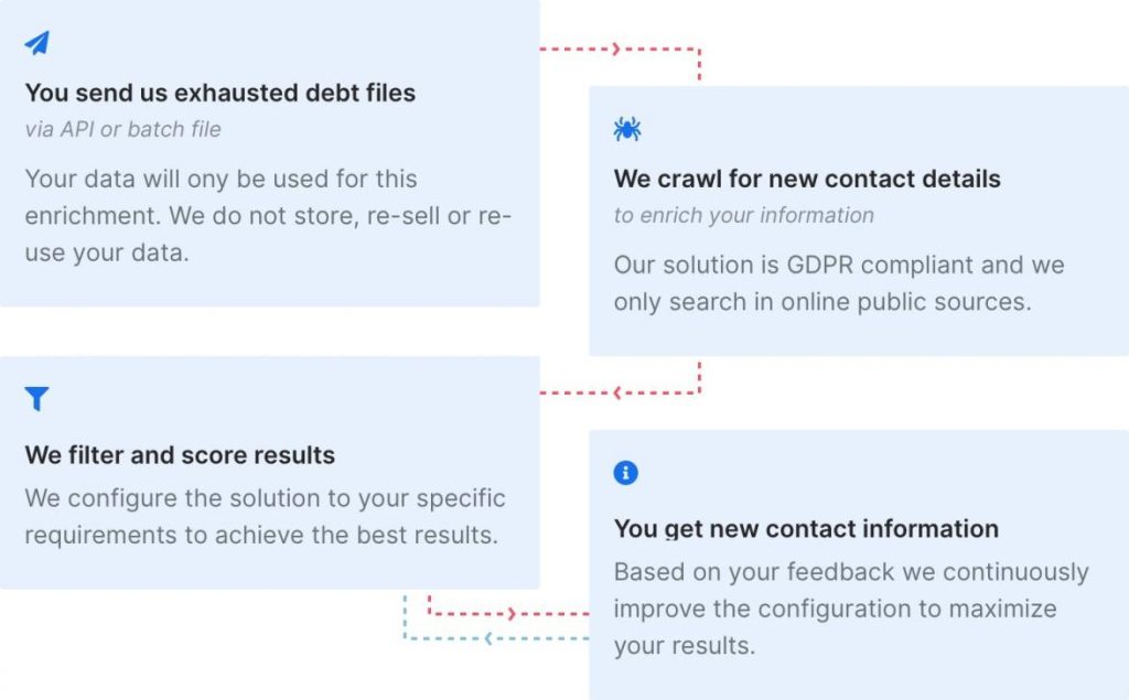Die Ergebnisse werden daraufhin analysiert und gefiltert, basierend auf Algorithmen, die mit den neu gefundenen Kontaktinformationen übereinstimmen und welche diese überprüfen. Auf der Grundlage Ihrer spezifischen Anforderungen und Ihres Feedbacks konfigurieren und optimieren wir die Lösung, um die Ergebnisse zu maximieren. Sobald der Datenprozess beendet ist, werden alle Daten vollständig aus unseren Systemen entfernt.